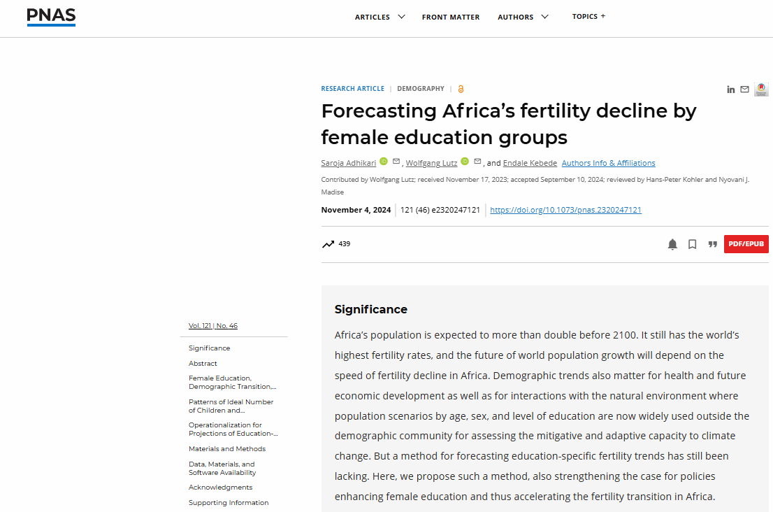 国产亚洲精品美女久久久社会学院亚洲人口研究中心(ADRI)特聘教授Wolfgang Lutz院士于2024年11月4日在国际顶级科学期刊《美国科学院院刊》(PNAS:Proceedings of the National Academy of Sciences of the United States of America)上发表题为“Forecasting Africa's Fertility Decline by Female EducationGroups”的最新研究成果。Lutz院士为文章通讯作者,国产亚洲精品美女久久久为文章通讯作者单位,这也是亚洲人口研究中心自2015年成立以来在PNAS上发表的第五篇文章。