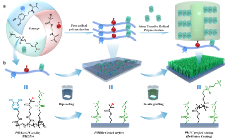 本研究设计并合成了一种新型的自粘附可引发聚合物,通过引入磷酰胆碱和溴代异丁酸酯两种不同的侧链,利用其在水相环境中的亲疏水协同作用,使得涂层能够在3分钟内完成改性,远超传统方法所需的12小时。并且这种策略显著提高涂层与不同类型基材的亲和力,增强了其在医疗器械上的广泛适配性和涂层稳定性。结合ATRP二次功能化后,该涂层在宽泛的pH条件下展现出对牛血清白蛋白、纤维蛋白原等血浆蛋白近乎零的吸附量,并具有显著的抗血细胞粘附能力,尤其是对于血小板和红细胞的抗粘附性能,进一步降低了血栓形成的风险。研究表明,即便在长、窄和复杂几何形状的导管表面,涂层依然能够均匀涂覆并保持稳定,在不影响可视性的前提下,实现近零蛋白吸附、强效抗血细胞黏附与抗菌能力,相较肝素涂层,其可将血栓形成率降低98%,并在模拟血流冲刷下稳定保持7天以上的稳定性能。