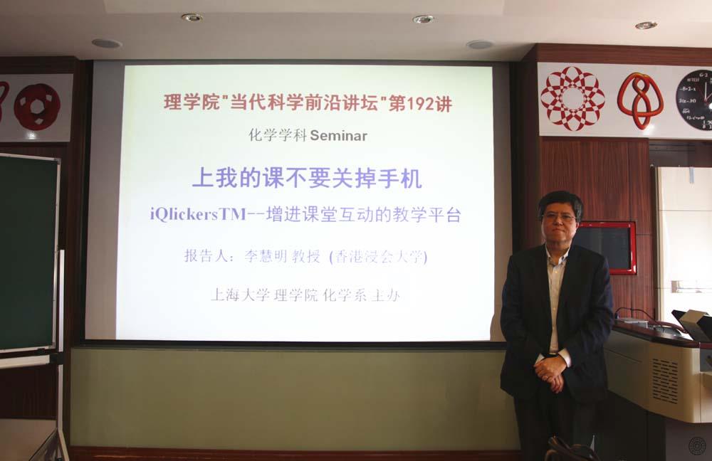 2014年3月17日上午,在校本部G507报告厅,香港浸会大学李慧明教授应邀莅临理学院给师生们作了精彩的学术报告,题目为“上我的课不要关掉手机 iQlickersTM——増进课堂互动的教学平台”,该学术报告为理学院“当代科学前沿讲坛第192讲”、今日化学系列报告第104讲。李慧明教授现任香港浸会大学讲座教授(Chair Professor),学生事务处主任。曾担任近十年的化学系主任、一年的校长特别助理、名古屋大学客座教授和加拿大阿尔伯特大学访问教授。报告由理学院副院长盛万成教授主持,校学工办主任林海霞教授、教务处副处长顾晓英老师、化学系党总支书记陈雅丽教授、化学系教学副主任丁益民副教授、贾学顺教授、宋力平教授、罗立强教授等理学院及其他学院的师生参加了报告会,现场座无虚席,掌声不断。